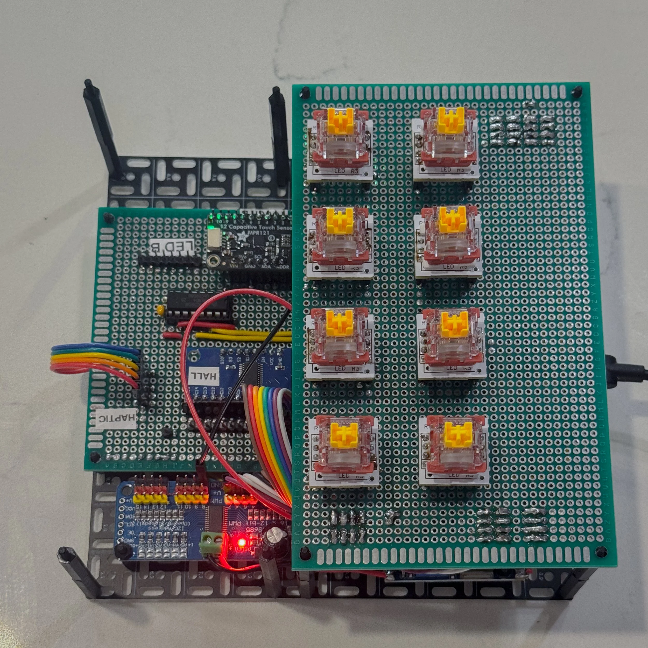 SENTIA TILES uses custom embedded hardware built around a Teensy microcontroller, combining Hall-effect velocity sensing, capacitive touch detection, and per note haptic motors for localized vibration feedback. Real time firmware manages multi modal sensing and ultra low latency response, enabling precise, pressure sensitive control and expressive tactile interaction across the grid.